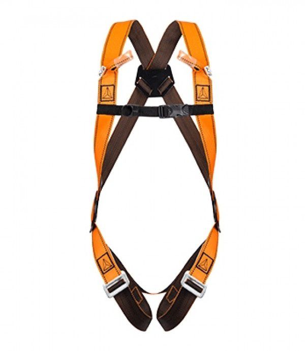 Cinturão de segurança tipo paraquedista fabricado em fita de poliéster 45 mm com costura zig-zag. Argolas de aço em "D" na região dorsal, dois laços de poliéster na região peitoral. Pontos de conexão: dorsal e peitoral para proteção contra queda. Fita sub-pélvica para sustentação de queda. Fivelas em aço para ajustes nas pernas. Placas laterais em plástico para regulagem.